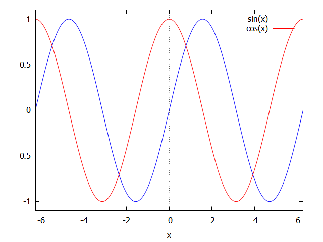 (%i1) plot2d([sin(x),cos(x)],[x,-2*%pi,2*%pi]);