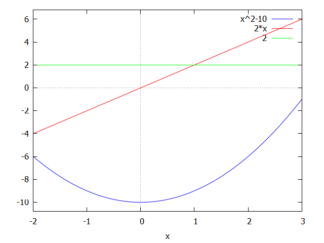 (%i8) define(f(x),x^2-10);\[\mathtt{(\textit{%o}_{8})}\quad f\left(x\right):=x^2-10\]