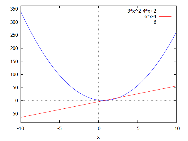 (%i1) define(f(x),3*x^2-4*x+2);\[\mathtt{(\textit{%o}_{1})}\quad f\left(x\right):=3\,x^2-4\,x+2\]